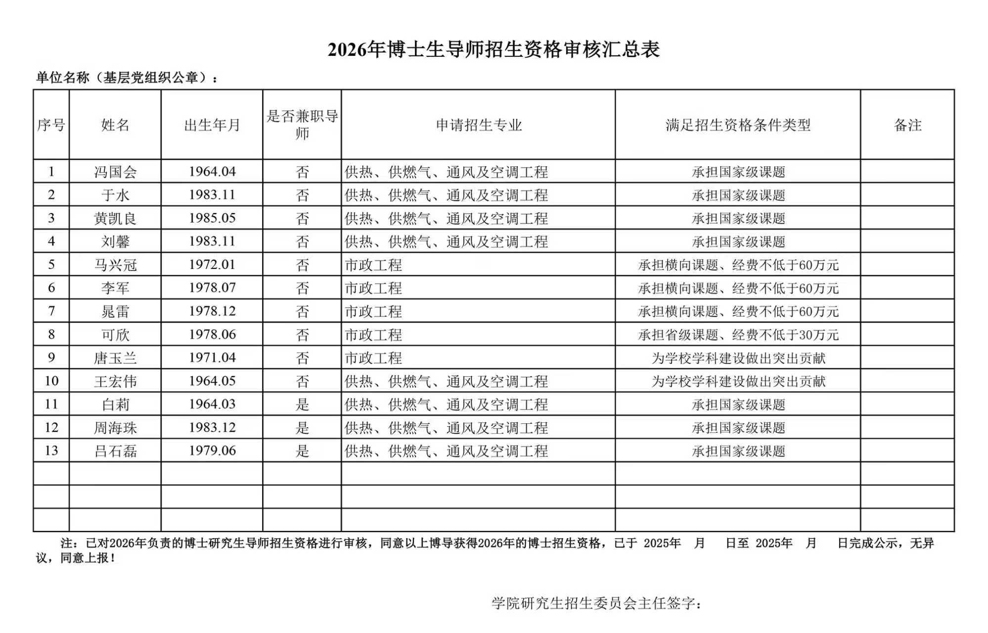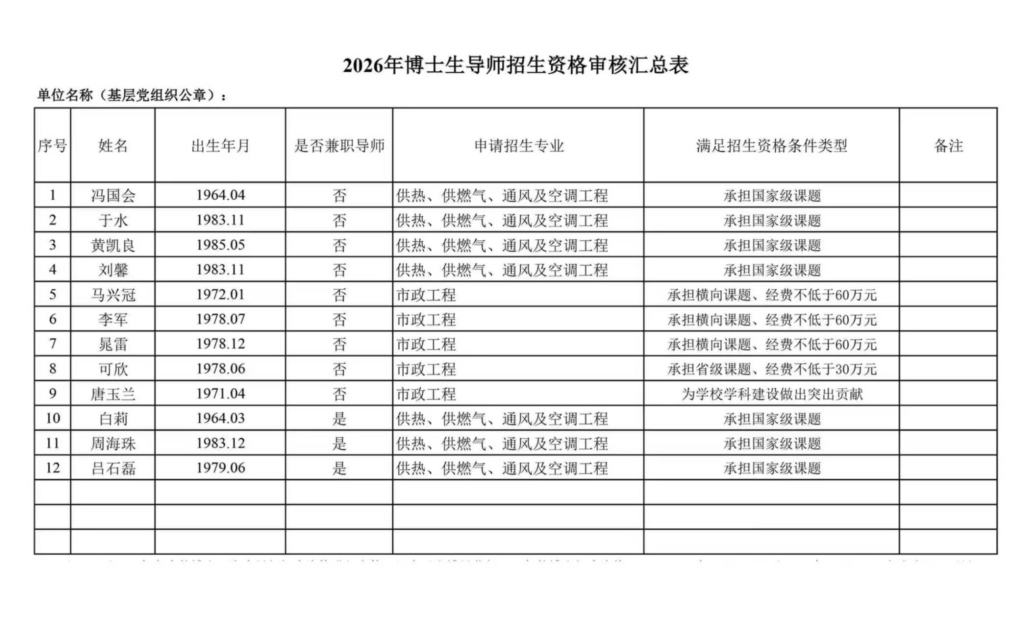 公示-市政与环境工程学院2026年博士导师招生资格名单